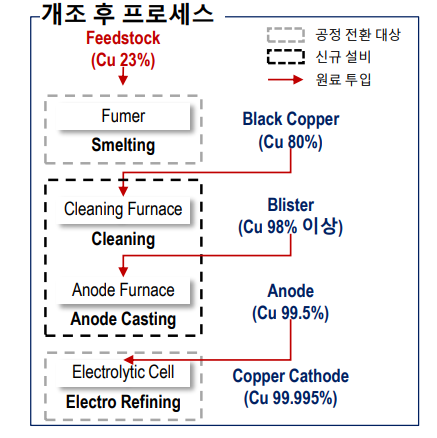 1. 온산 Fumer개조 프로젝트: Fumer들은 아연, 연, 동, 인듐, 은 등의 금속을 회수해주는 장치를 의미한다. 즉, 이 Fumer은 원재료를 처리하고 남은 유가금속(돈되는 금속)을 회수하는 작업을 진행해주는 장치이다. Fumer에 구리가 일부(23%)포함된 원료를 넣으면, 순도 99.995%의 구리를 얻게 해주게끔 Fumer을 개조하는 프로젝트이다. 고려아연은 총 6개의 Fumer가 있다. 이개 원래 6개가 있었는데, 1개를 동 회수 장치로 만들어서, KZAM에게 수급하려고한다. 전자폐기물이 들어오면 전처리 후 동을 뽑고, 그 부산물도 Fumer을 통과시켜서 동을 뽑는 작업을 진행한다. 원래 4만톤정도의 동을 만드는데, 이 것을 하고나면 6만톤까지 증가한다. 25년 1월까지 투자설비가진행된다 (규모는 약 700억).