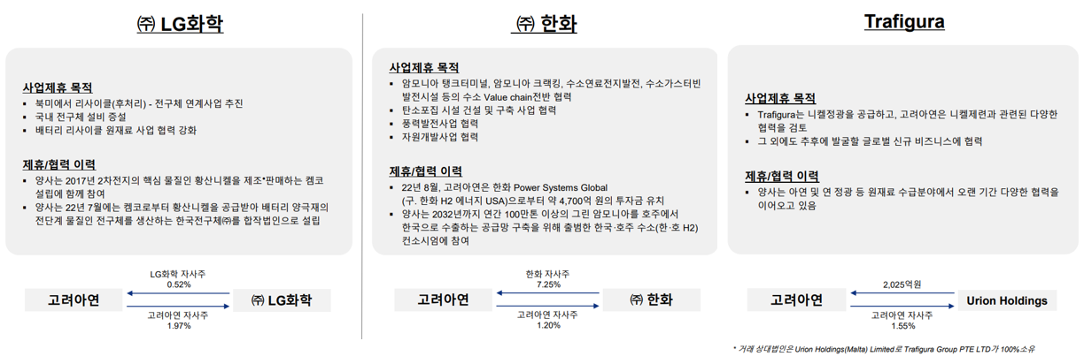 - 한화: 고려아연 자회사(호주 소재)가 암모니아를 만들면, 한화가 한국까지 저장,유통,발전을 해준다.