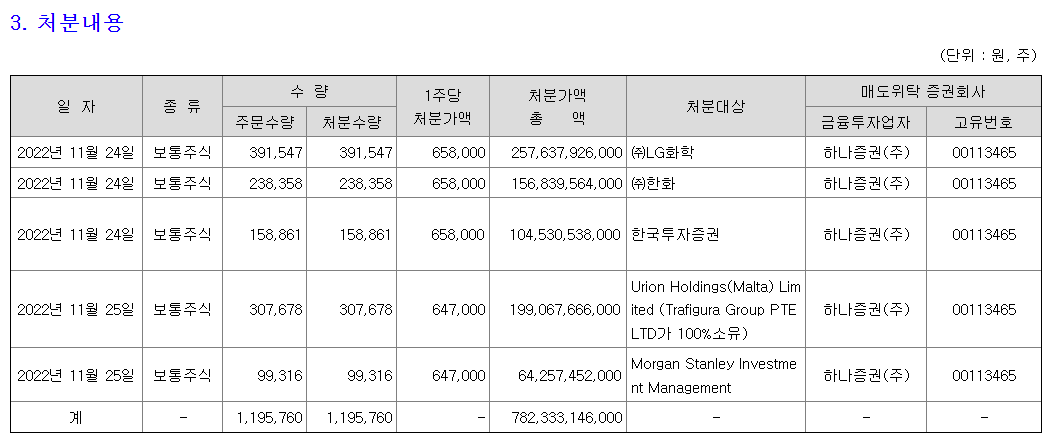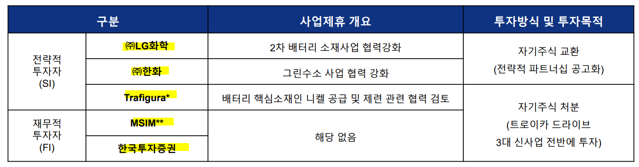 위의 표를보면, 전략적투자자(SI)와 재무적투자자(FI)로 나뉜다, 주 관심은 LG화학, 한화, 트라피규라(Trafigura)이다. 상세내용은 아래와 같다.