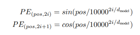 이 때, 조건이 있는데, 포지셔널 인코딩의 차원은 d_model 같아야하며(=embedding 값의 차원과 같아야하며, 그래야 더할 수 있다). 이를 위해, 본 논문은 아래와 같이 2개의 함수를 이용해서 positional encoding을 생성한다.