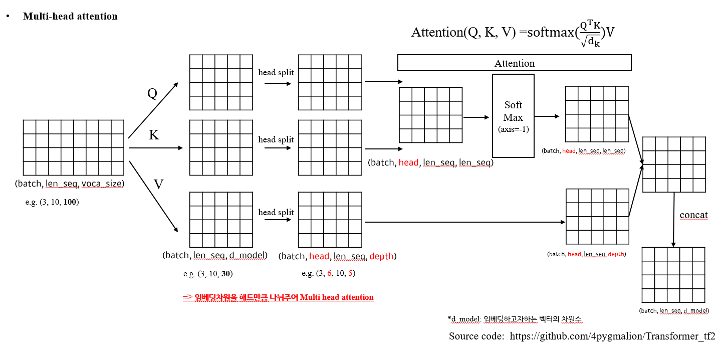 아래는 필자가 직접 그린 Multi-head attention의 matrix shape이다. Q, K, V가 한 오리진인 self-attetnion류이고, head split을 위해서 d_model을 (head by depth)으로 나눠주는 것이 특징이다.