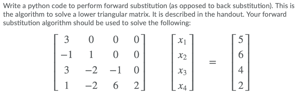 따라서, $Ly=I$을 먼저 구한 다음에 순차적으로 x까지구하면된다. 문제는 이러한 방법이 왜 편리하냐를 의미하는 것인데, 이는 전방대치(forward substitute)와 후방대치(backward substitute)을 쓸 수 있어서 그렇다. 아래와 같이 전방치(forward substitution)방법으로 구하는 방법은 하삼각행렬만 숫자가 0이 아니고, 나머지는 0이기에, 직관적으로 x1은 5/3임을 알 수 있다. 이를 구했기에, 2행..4행까지 바로 다 구할 수 있다. 그렇기에 편리하다는 의미이다.