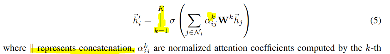 Multihead-attention coefficient: 저자들은 위의 attention coefficient을 k개를 만들어서 concat하는 방법으로 Multi-head attention을 계산도 해봄.