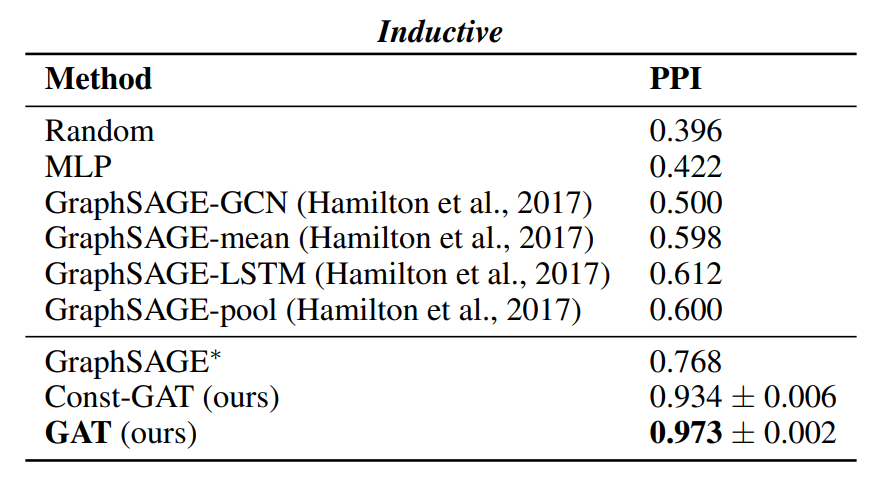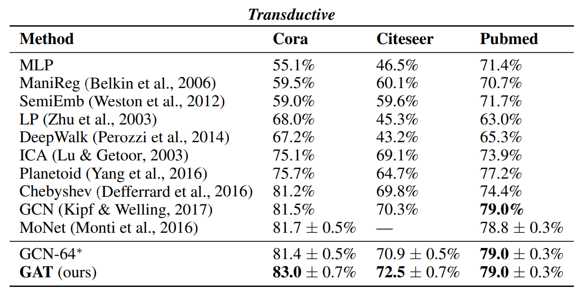 모델성능: 성능은 Transductive, inductive 두 가지 방법으로 설명함. (Transductive, inductive을 모른다면, 다음의 포스팅을 클릭). 1) Transductive dataset은 Cora, Citeseer, Pubmed라는 논문 인용에 관한 데이터. Node: 논문, edge: 인용. Node feature: Bag of words in document. Node label: class label. 2) Inductive learning: PPI(단백질-단백질-교호작용) 데이터세트. 그레프 분류