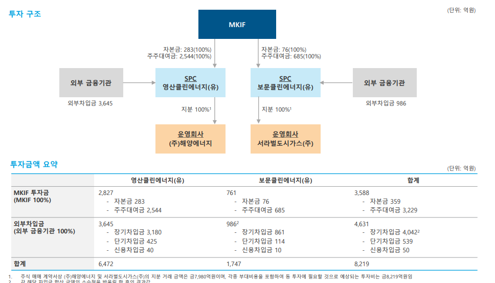 MKIF가 직접마련한 자본금과, 주주들에게 유상증자한 금액을 합쳐서 각각 두 SPC에 투자한다. 각 SPC은 SPC 자회사인 운영회사를 직접 100% 소유한다.