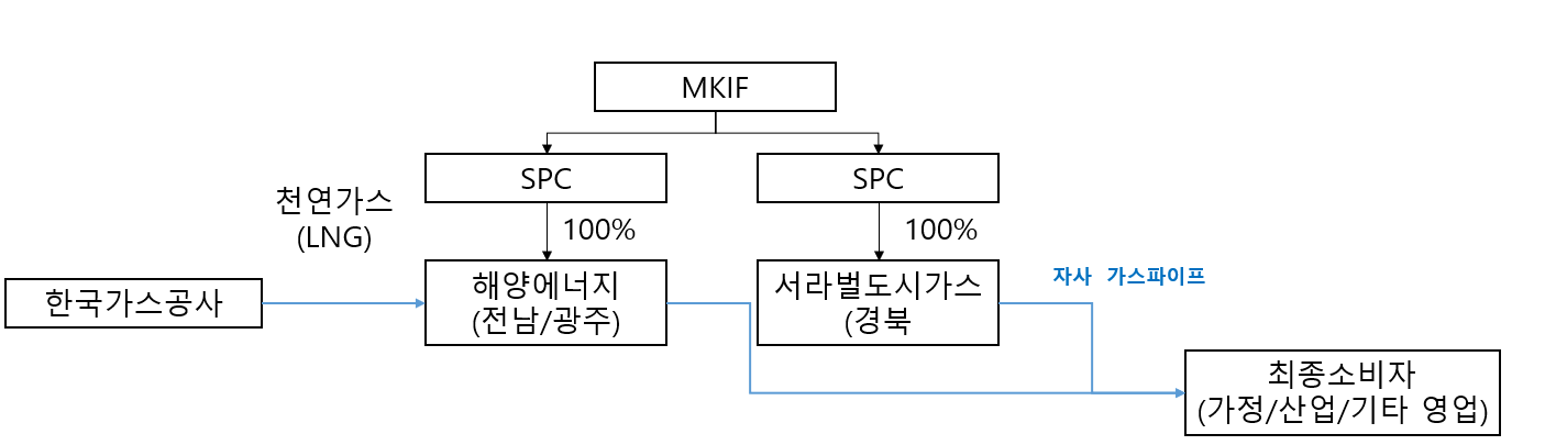 아래의 그림처럼, 검정은 지분, 하늘색은 도시가스 흐름이다. 한국가스공사가 운영회사인 해양에너지 및 서라벌도시가스에 천연가스를 주면, 그걸 이용한 발전한 에너지를 최종소비자에게 두 회사가 공급한다. 이 공급시에는 가스는 가스파이프로 공급하애햐기때문에 대규모 초기 투자금이 들어간다.
