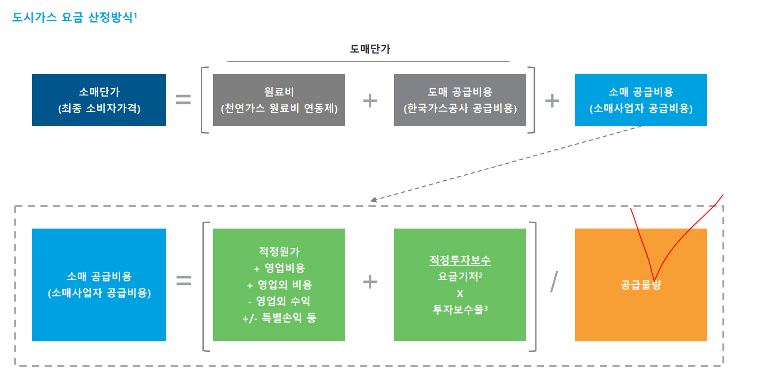 아래의 기준과 같이 어찌어찌해서, 소매단가를 정했으면, 소매단가에 * 공급물량을 곱해서 결국에 수익을본다 (P는 정부에서 정해주지만 Q가 늘어난다면 이득이라는 가정하에 투자하는 것으로 보인다). 가스가격이 상승해도 소비자에게 전가가 가능한 구조로 보인다.