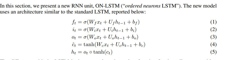 2. LSTM : Ordered neuron LSTM은 기본적인 LSTM연산을 필요로하고, 그 위에다가 master gate을 부착한다. 그렇기에 LSTM연산도 포함된다.