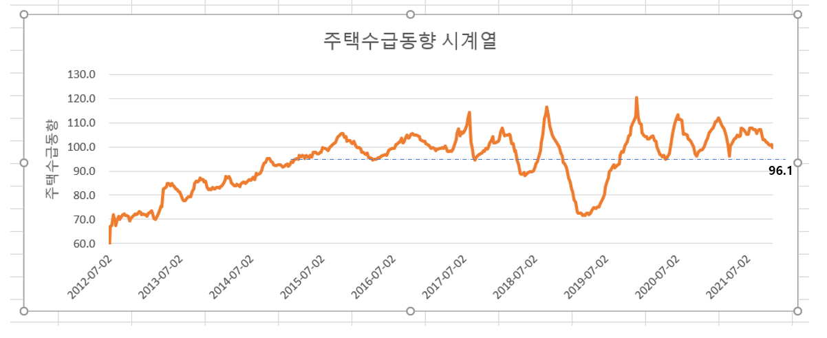 아래의 주택수급동향 시계열을 보면, 왠만해서는 96.1을 깨지 않는 것을 볼 수 있다. 어느정도 96.1이어도 다소비슷한 상황이라는것이고 딱히 시장심리가 급격히 얼어붙는경우가 드물다는 것으로 해석할 수 있다. 주의할 것은 주택수급동향에서 100보다 미만이라고 가격이 하락하는 것은아니다. 2019년에 주택수급동향에 큰 조정이 있었음에도, 주택가격은 계속 올라왔던 것은 사실이다. 다른 요인(예, M2, M1)과 분석하는 것이 더 타당해보인다.