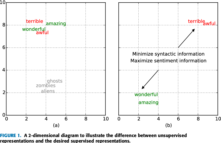 범용적인 임베딩모델(예, doc2vec, paragraph2vec 이하 PV)은 정말 단순한 알고리즘으로 hidden layer가 하나만 존재하여 매우 학습이 편하고, 쓰기도 편하지만, 임베딩에 다음과 같은 문제가 있다. word2vec의 CBOW(continous bag of words)을 생각하면, 단어벡터(word vector, 단어를 임베딩한 벡터)를 구문론적(syntactical)으로 학습하기도하고, 의미론적(semantic)적으로 학습하기도 한다. 예를 들어, "the cat sat on the mat"이라면, cat을 예측할땐, 주변단어인 the와 sat을 이용해서 예측한다. 따라서 유사한 단어가 동시에 많이 출현될수록, 같은 벡터로 표현될 확률이 높고, 주변단어의 쓰임이 비슷하게 나왔을 때도, 유사한 벡터로 임베되는 경향이 있다 (Figure 1. A). 하지만, 해결해야하는 문제가 감정분석(sentimental analysis)로, wonderful과 amazing이 같은 그룹으로, terrible, awful이 부정그룹으로 분리되서 해야한다면 어떨까? 동시출현 또는 유사한 단어가 많이 출현하는 것을 학습하여 임베딩하는 word2vec의 이런 학습방식은 특정테스크에 모두 걸맞게 쓰기가 쉽지가 않다. 이런 일반화된 분석방법으로는 이런 임베딩의 표현의 의사결정바운더리(decision boundary)을 긋기가 쉽지않다. 본 논문은 word2vec, paragraph2vec, doc2vec의 제한점을 해결하고자 시도했던 논문이다.