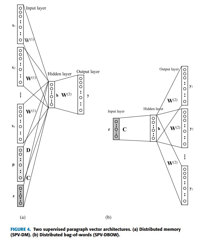 해결방법은 다음과 같다. word2vec의 아키텍처와 같이 하나의 입력레이어, 하나의 히든레이어, 하나의 출력레이어로 구성한다(Figure 4-A). 좌측에 아키텍처의 구성을보면, $x1,..., x_{\gamma}$까지는 한 문단에 들어가있는 단어가 one hot vector로 변환된 벡터를 의미한다. 각각 one-hot vector로 표시할 때, 총 단어의 개수가 V라면, V개 원소의 개수를 가지고, 원소중 하나만 1인 벡터가 된다. 차이점이라면, 다음과 같은 벡터들도 입력값에 전달된다. 바로 도큐먼트의 one-hot vector인 $p$와 클레스의 라벨인 $z$가 추가로 전달된다는 것이다. 아래의 그림에서는 $p$은 전체 문서(documents)의 수를 의미한다. $z$은 클레스라벨을 의미해서, $M$개의 클레스가 존재한다고 했을 때, 각각 하나하나를 one-of-K(one-hot)벡터로 인디케이팅한 것을 의미한다. 그리고 h에 해당하는 히든레이어의 출력을 $\delta$개의 원소를 가진 벡터라고하자.