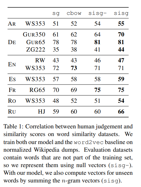 1. word similarity: sg(skip-gram), cbow(continous bag of words), sisg-(subword information skipgram with OOV->null vector표기), sisg(subword로 처리한경우) AR, DE등은 아랍, 체코, 덴마크등의 언어인데, human judgement간의 유사도를 비교하였을때 가장 높은 성능을 보였다.