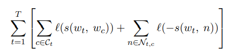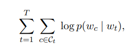 방법론을 이해하려면, word2vec의 skip-gram을 이해가 요구된다. 가장 중요한건 Skip-gram은 주어진 단어 하나로, 주변단어를 예측하는 문제이기 때문에, 아래의 같은 목적함수를 가진다. $w_{t}$은 t번 째의 주어진 단어이며, $w_{c}$은 t번째 단어의 주변단어이다. 즉, 한 단어가 주어졌을 때, 주변단어를 얼마나 잘 맞추는지에 관한 목적함수이다. 이 목적함수를 최대화하면된다. 그리고나서, 각 단어를 잘맞추는지(잘 분류해서 선택했는지) Softmax함수로 평가하면된다.