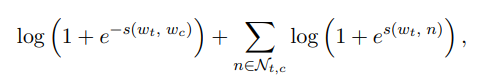 추가로, 기술적으로 할만한 것으로는 절대 주변에 없을 것 같은 단어들을 추가로 전달하여 손실함수로 사용해볼 수 있다. 이에 관한식이 아래와 같다. log()의 안에있는 식을 L()로 표현하면 아래의 식으로 변환할 수 있다.