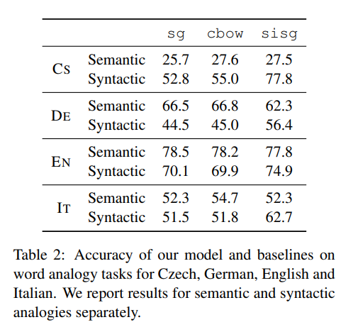 2. word analogy: analogical reasoning task로 word2vec에서 king-man=queen과 같은 논리적 추론을 의미한다. 과거에 각 언어별로 만들어 놓았던 analogical reaskong task로 실험해본 결과 sisg이 syntatic한 부분에서 우수한 성능을 보였다.