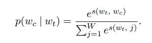 방법론을 이해하려면, word2vec의 skip-gram을 이해가 요구된다. 가장 중요한건 Skip-gram은 주어진 단어 하나로, 주변단어를 예측하는 문제이기 때문에, 아래의 같은 목적함수를 가진다. $w_{t}$은 t번 째의 주어진 단어이며, $w_{c}$은 t번째 단어의 주변단어이다. 즉, 한 단어가 주어졌을 때, 주변단어를 얼마나 잘 맞추는지에 관한 목적함수이다. 이 목적함수를 최대화하면된다. 그리고나서, 각 단어를 잘맞추는지(잘 분류해서 선택했는지) Softmax함수로 평가하면된다.