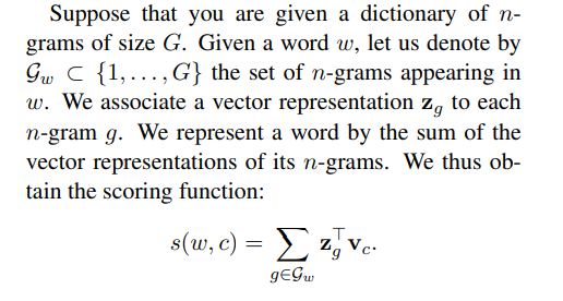 Fasttext의 핵심을 subword model이다. 주어진 단어가 w가 있다고 했을떄, 각 단어를 w의 bag of n-gram으로 표현하는 것이다. 예를 들어, where이라는 단어가 주어졌을 때, <whe, her, ere>로 표현할 수 있다. 추가로 Fasttext은 원래 단어까지를 넣어 하나의 bag-of-n-gram을 구성한다. 즉, where -> <whe, her, ere, where>까지를 하나의 세트로 구성해서 표현한다. 이는 <her>의 단어와는 다르다. 왜냐하면 <her>은 하나의 세트가아니라 독립적인 단어이며 <whe, her, ere, where>안에 있는 "her"은 구별될 수 있기 떄문이다. 각각 bag-of-ngram에 표현될 수 있는 집합을 g라고 표현하고, 각n-gram으로 표현한게 G만큼의 사이즈를 가지면 아래와 같이 표현할 수 있다. $z_{g}$은 bag of n-gram에서 표현된 서브단어(subword)이고, v은 맞춰야할 단어를 의미한다. 따라서, subword와 원래단어를 동시에 임베딩하는 형식으로 OOV문제를 개선한 모델이라고 할 수 있다.