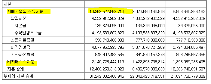 아래는 이마트의 제 11기의 연결재무제표이다. 지배기업의 소유지분이 10조이다. 그리고 비지배주주지분은 2조1천억이다. 자회사라고 100%지분이 아니기 때문에, 이마트가 자회사로 편입한 회사중에 실제로 지분을 갖고있는 만큼(비지배주주지분)이 2조 1천억이라는 것이다.
