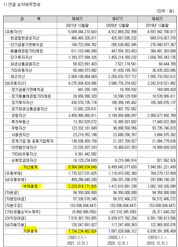 CASE study(고려아연): 아래는 고려아연의 2019년부터 2021년의 3기의 연결 요약재무정보이다. "연결"은 종속회사의 재무정보를 포함한다는 의미이고, "요약"은 말그대로 모든사항을 보여줄 수 없으니, 요약(summary)하여 큼직큼직한 요소들에 대해서만 보여준다는 것이다. 고려아연의 48기의 자산총계는 9조9천억이며, 이를 구성하는데는 부채종계는 2조2천억원이며, 자본은 7조 7천억원이라는 것이다. 좀 더 자세하게는 자본 7조 7천억원을 구성하는데 있어서, 7조 5천억원이 이익잉여금이다. 즉, 회사가 커가면서 대부분 자본을 이익잉여금을 키워나가면서 자본을 구성했다는 것이다. 여기서 헷갈리지 말아야할 것은 "이익잉여금은 이익이 나고 남은 잉여의 현금"의 의미가 아니다. 구체적으로는 이 말은 반은 맞고 반은 틀리다. 잉여금이라는 것은 남은돈인데 왜 회사에 남은 돈이 아니라는 것인가? 이유는 이익잉여금은 현금외에 다른 자산의 형태로 바꿔놓을 수 있기 때문이다. 즉, 재무상태표에서의 "이익잉여금은 사업을 하고 남은 금액의 누계이지, 반드시 현금형태로 있을 필요는 없고, 여러 형태로 바꿔놓은 자산들의 누계액"으로 보는것이 적절하다. 상식적으로 고려아연의 시가총액이 7~11조 정도인데, 제 48기의 이익잉여금이 7조5천억이 현금이 있는것이 말이되는가? (2019~2021). 여태 48년동안 벌어놓은 금액이 7조 5천억정도라는 것이다.