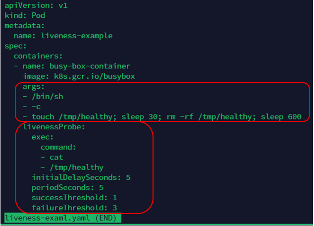 아래의 예시는 buxybox라는 이미지를 이용해서 컨테이너 1개짜리를 담은 "liveness-exam"이라는 Pod을 생성한다. 추가로, 컨테이너를 실행할 때, 컨테이너 상의 '/tmp/healthy'라는 파일을 만들고 30초 후에 삭제하는 명렁도 같이 넣어놓았다. 즉, 컨테이너가 실행되고나서 30초 동안만 파일이 존재할 것이다.