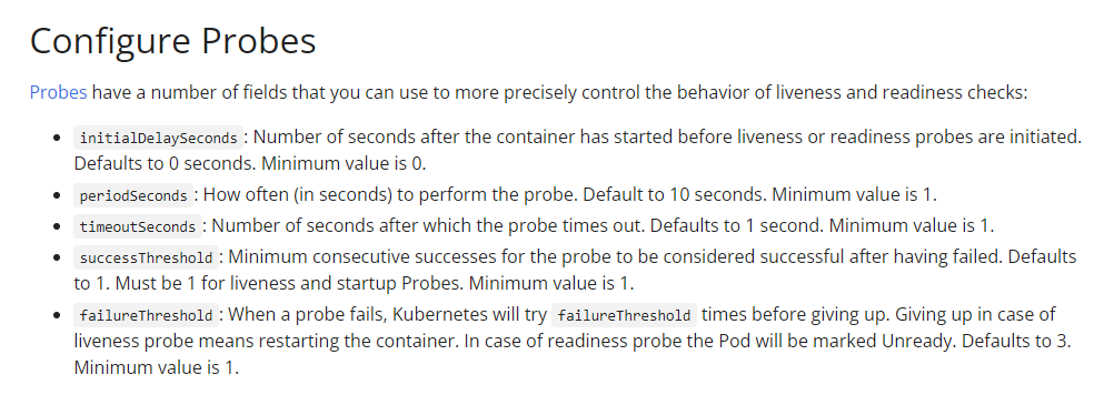 livenessProbe을 사용하기 위해서는 몇 가지 전달해야하는 인자가 있는데, 아래와 같다. 자세한 인자들(Configuration)은 여기에서도 확인이 가능하다. initialDelaySeoncds은 컨테이너 실행 후 몇초 뒤에 probe을 실행할 것인지에 대한 속성이다. periodSeoconds은 몇초 주기로 프로브를 실행할 것지에 대한 속성, timeoutSeconds은 프로브를 실행하고나서 몇초 내에 명령들이 종료되어야하는지에 대한 속성, seccessThreshold은 이 프로브가 몇 번 연속 성공하면 성공이라고 볼것인가에 대한 것이다. failureThreshold은 프로브가 몇 번 실패해야 실패로 볼 것인지에 대한 기각역이다.