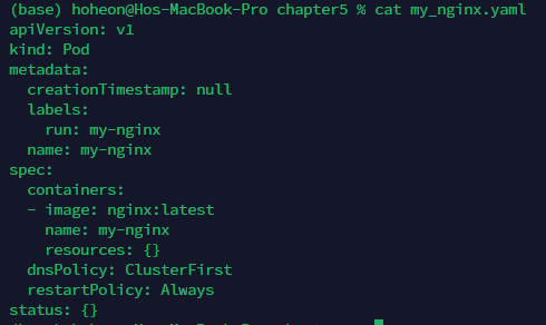 - spec.containers: 이 필드아래에 container을 적으면 하나씩 컨테이너가 생긴다. 아래의 예시는 컨테이너 1개를 생성하는 예시이다. "-"(하이픈)은 하위필드를 배열로 묶겠다는 것이다. 즉, 파이썬의 딕셔너리로 생각하면 {"spec": {"container": [{"image":"nginx":"latest"}, {"name":"my-nginx"}, {"resources": {}}]와 같이 속성들을 containers의 하위 필드 배열로 취급하겠다는 것이다.