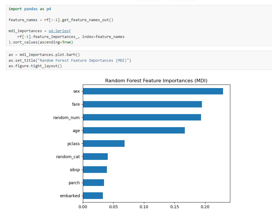 아래의 그림을 보면 feature importances (MDI)라는 것이 표시되어있다. 이는 위의 과정(Gini importance)을 이용해서 각 노드를 나눴을때 불순도가 크게 변화하는 정도의 평균을 계산했다는 의미이다. (이 데이터셋은 타이타닛 데이터셋). 생존자와 사망자를 구분할 때, sex을 이용해서 구분했을 때, sex을 안썼을 때보다 평균적으로 더 트리구조가 깔끔하게 나뉘어져나갔다는 것을 의미한다.