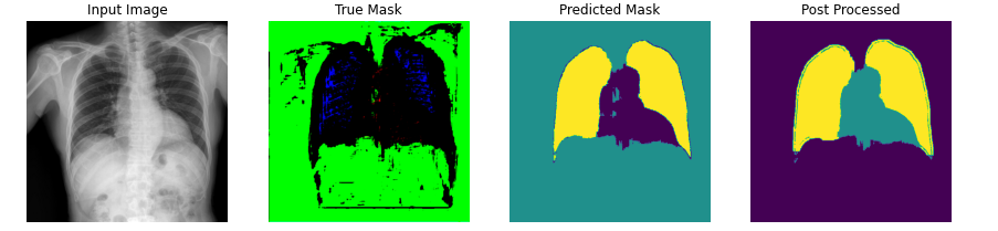 Unet의 후속모델인 ResnetUnet을 이용하여 심장부와 폐부를 Segmentation했다. 그리고 그 예측결과 중에, predicted Mask처럼 구멍뚤린 부위를 후처리(Closing)을 이용해서 매꿔주어 성능을 향상시킬 수 있다.