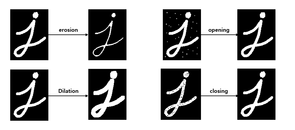 - Opening (오프닝): Erosion후에 Dilation을 적용하는 연산. Erosion으로 노이즈 같은 점을 없애주고 이미지를 확장하기에 noise reduction용으로도 쓰는듯하다.