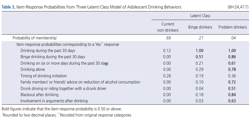 2. 세 그룹으로 나뉘어진 것을 알았으니, 각 군에 이름을 붙여본다. 이 간호학과 선생님들께서는 Current non-drinkers, Binge drinkers, Problem drinkers 라고 네이밍을 줬다. 첫 행은 각 군에 대한 membership에 대한 확률을 나타낸다. Current non drinker은 대부분 24,417명중에 69%정도는 이 군에 할당될 확률이 있단 말이다. 그리고, 이 군에 있는 사람들은Drink during the pas 30 days할 확률은 0.12라는 말이다. 즉 이 변수("Drink during the pas 30 days")인 카테고리컬이다. 이 변수에 해당되냐 안되냐를 보여준다. 반면 Binge drinkers, Problem drinkers에서는 1.00, 1.00이니 무조건 이 군에 속할려면 최근 30일 이내 술마셔야하는 사람이어야 한다는 것이다.