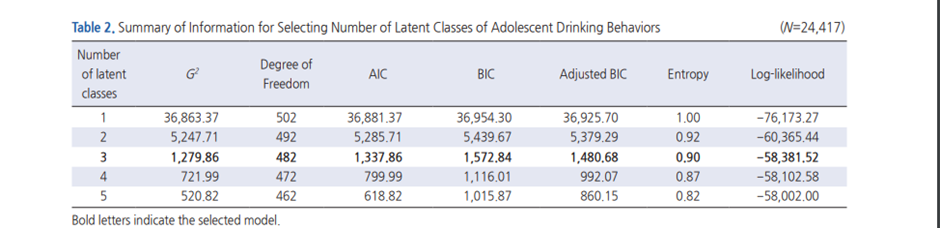 LCA의 모형이 얼마나 데이터셋을 잘 평가하는지는 the likelihood-ratio statistic (G2), Akaike information criterion (AIC), Bayesian information criterion (BIC), Adjusted BIC, the log-likelihood, Entropy가 있다. Entropy 값은 클수록, G2 , AIC, BIC, Adjusted BIC와 the log-likelihood 값은 작을수록 모형 이 자료에 적합하다는 것을 의미한다.