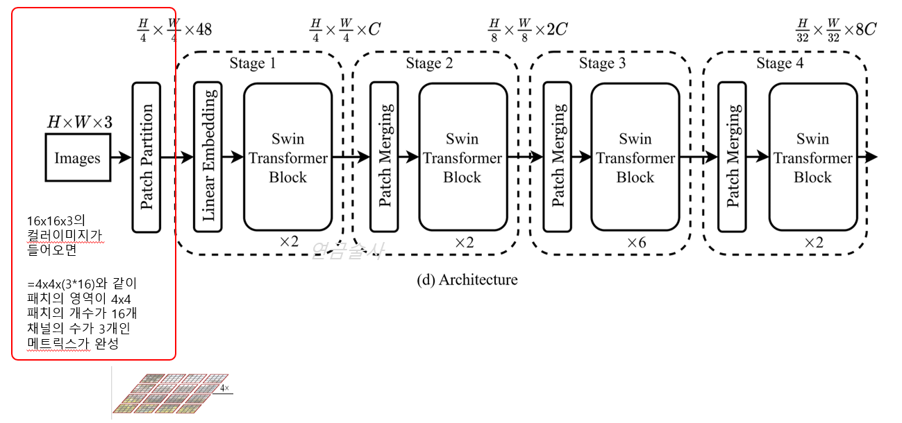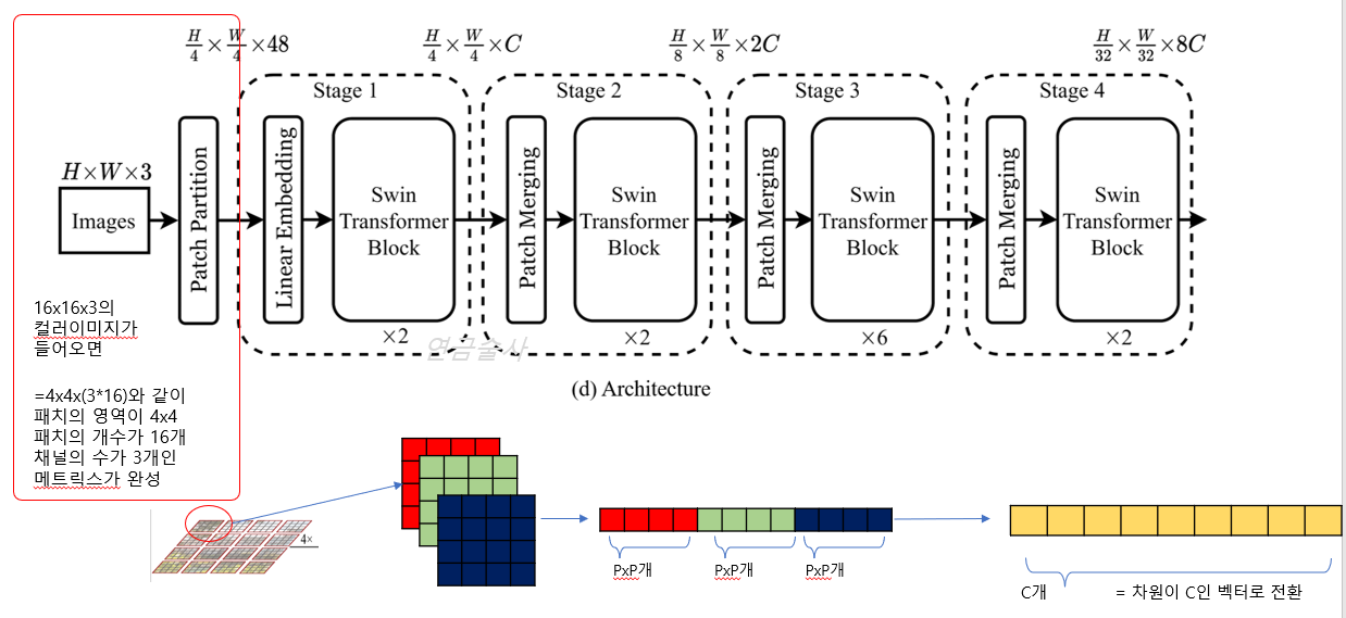 모델 설명: 1) 패치의 분리, 2) 패치의 임베딩, 3) 트렌스포머(어텐션 + Shifted window 파티셔닝), 4) 패치 병합과정의 연속