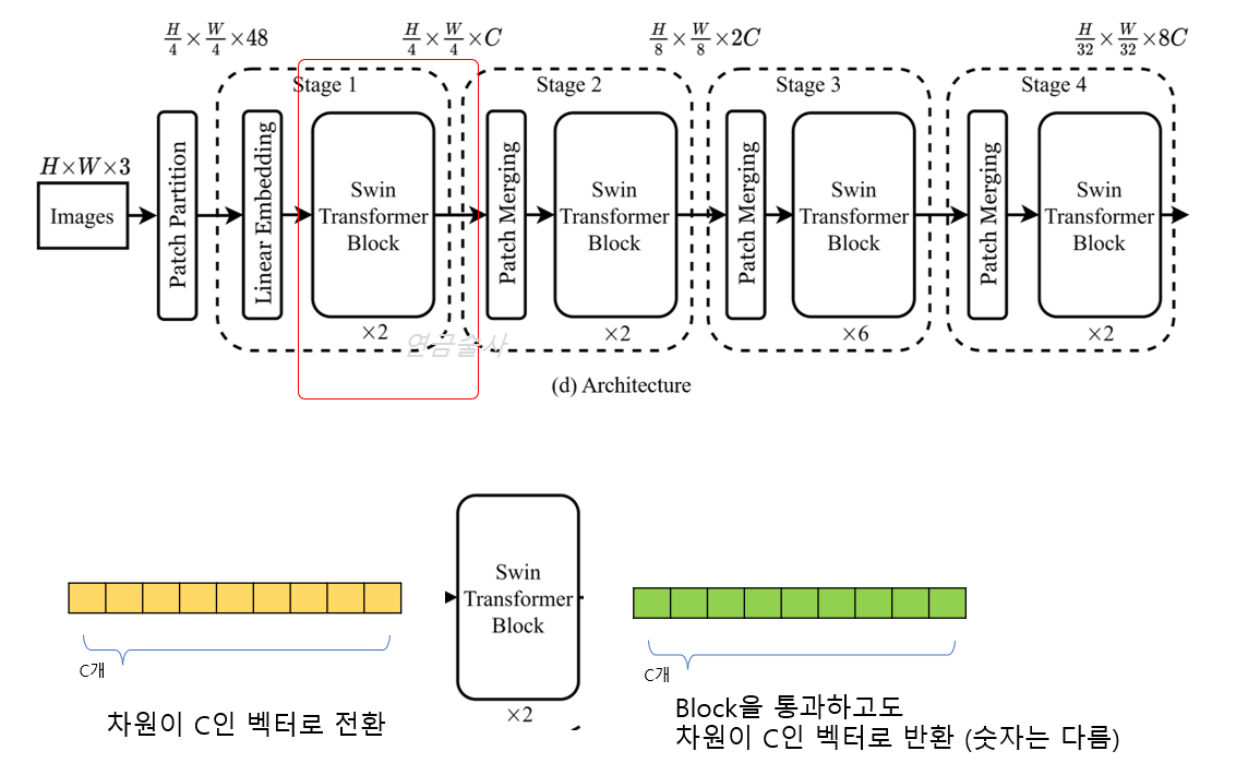 4. Stage 1에서는 Swin transformer block을 통과시킨다: 이 때의 각 패치의 차원은 동일하게 유지한다. 즉 C에서 C로 나온다. 다만 벡터내 원소의 숫자는 다르다.