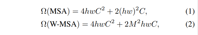 한 윈도우에, 패치가 M x M이 있다고 가정하고, 일반적인 global self-attention을 하는 경우(1)와 widnow내 h x w개의 패치가 있는 경우를 계산복잡도를 구하면 아래와 같다. 중요한건 총 패치수인 h x w 수가 증가할 때, (1)의 식은 제곱으로 복잡도가 증가하지만, (2)의 식은 선형적으로 증하한다는 것이다. 윈도우 내에만 self attention하는 것이 컴퓨터비전에서 계산 복잡도를 낮출 수 있기 때문에, 이 방법을 저자들은 생각했다.