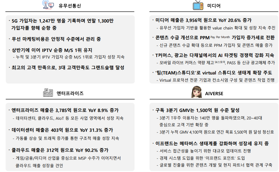 주요사업부문은? 4가지: 유무선통신 / 미디어 / 엔터프라이즈 / AIVERSE.