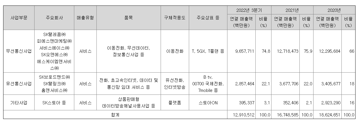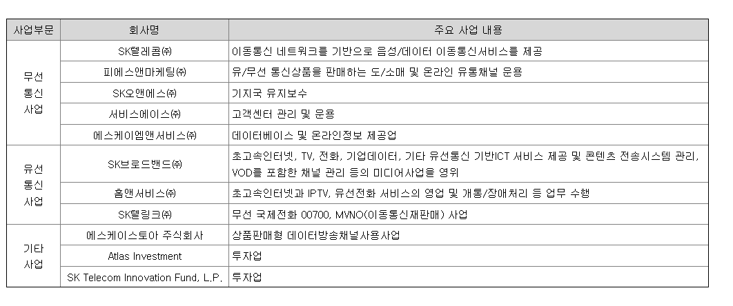 1. 유/무선통신: 1)유무선통신에는 MNO(Movile Network Operator, 이동 통신망을 보유한 이동 통신망 사업자, 직접 주파수를 할당받아 사업하는 것)부분이 우리가 알고있는 대부분의 SK텔레콤의 사업부문에 해당된다. 이 외에도 MVNO(Mobile Virtual Network Operator, 흔히 알뜰폰 사업자)도 여기에 포함되는데, SK텔레콤은 통신망을 가지고 있으니, MVNO사업자에게 빌려주고 돈을 수취하는 구조이다 [2]. 또한, SK텔레콤의 자회사(연결회사)인 SK브로드밴드의 주사업은 IPTV, CATAV 서비스를 제공하는 미디어사업과 유선통신사업(초고속인터넷, 유선전화, 전용회선, 데이터센터 등)을 영위한다. 앞서 말했지만, SK브로드밴드 사업을 유의깊게 보아야한다.