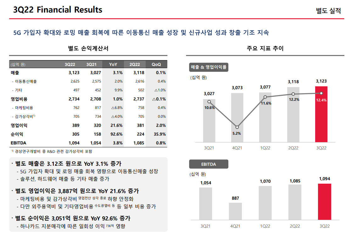 22년 3월 컨콜에서는 SKT은 다음과 같이 말하고 있다. "대 내외 환경이 어려운 상황에서도 ‘EBITDA(법인세 이자 감가상각비 차감 전 영업이익) – CapEx(설비투자)’의 30~40% 수준을 연간배당재원으로 설정해 분기 배당을 지속 하고 있다."[13] 우리가 바라는 것은 배당액이 느는 것. 즉, EBITDA가 늘거나, CapEx가 적정수준으로 관리되어 크게 지출을 안하거나 이다. CapEx은 최근에 들어 3.5Ghz은 이미 장비설치를 완료했다. 그리고 추가적인 3.5Ghz 주파수대역이나오는것도 큰 지출은 아니다 (28Ghz설치비가 아직 어느정도인지 감이안나옴). 따라서 EBITDA만 늘면된다. ARPU증가랑 5G고객 순증인 EBITDA을 증가시켜줄것이다. 알뜰폰 제외 5G고객의 M/S가 SK텔레콤이 1위인 것을 생각하면 배당여력도 증가할 수 있을 것이라고 본다 .