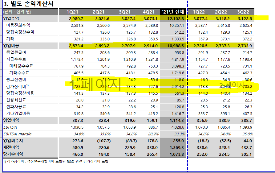 - 마케팅비도 줄일 수 있으면 줄일 수 있는 비용이라 SK텔레콤에서도 신경쓰는 비용이다. 회사 분할전, 연결손익이라 좀 애매하긴한데 IR자료에서는 이를 명시하고있다. 별도실적이기 떄문에, 거의 이동통신 매출만 있다. 이동통신매출을 내기 위해서 투자한 마케팅비용및 감가상각비가 작년대비 줄어듬이 보인다. 마케팅비용은 당분기에 안쓰면 그만인데, 감가상각비는 하향 안정화되었다는것은 내용연수가 다 되어, 상각 종료가 된 자산이 꽤 있다는 것으로 판단된다. 아마 15년전 취득한 자산들의 내용연수가 만료되었다는 것이다.