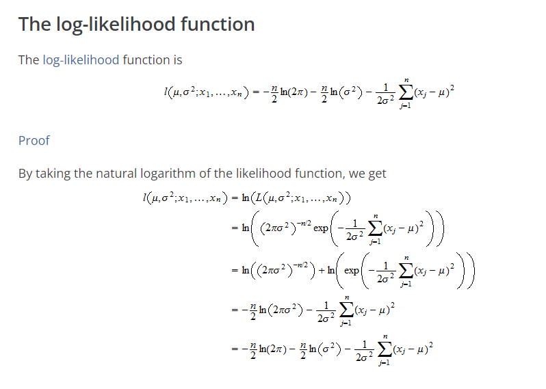 $= -\frac{n}{2}ln(2\pi)-\frac{n}{2}(\sigma^{2}) - \frac{1}{2\sigma^{2}}\sum_{j=1}(x_{j}-\mu)^{2}$ 을