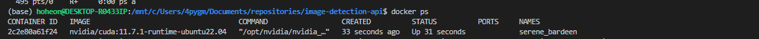 컨테이너명이 "2c2e80a61f240a689d1d6d13a94c886fdab9508fc6226e1889ac5cbb623a5528"로 반환되어 컨테이너가 실행중임을 알려준다.