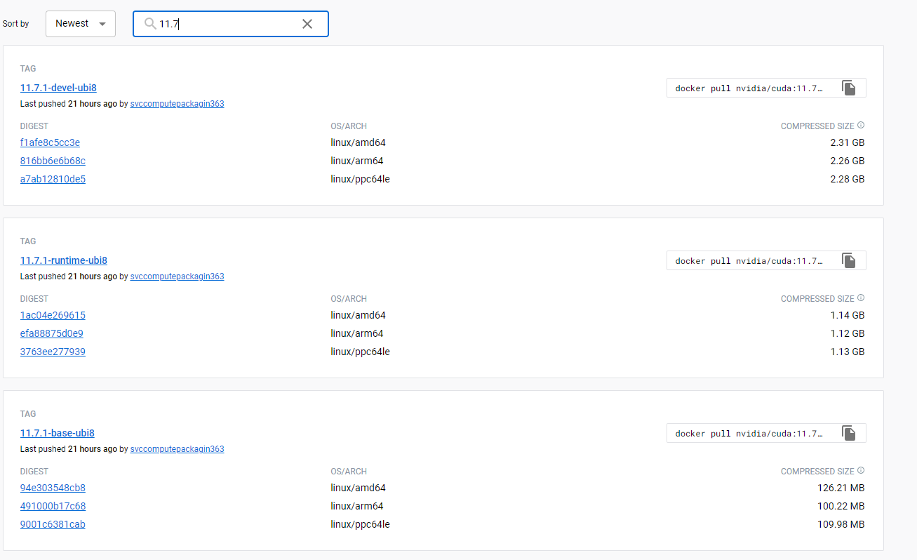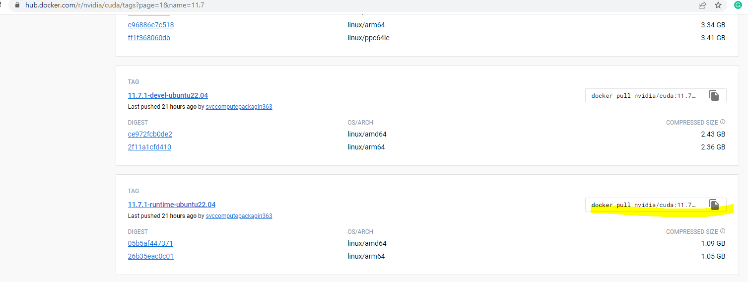 아래와 같이 CUDA 버전에 맞는 이미지를 찾는다.