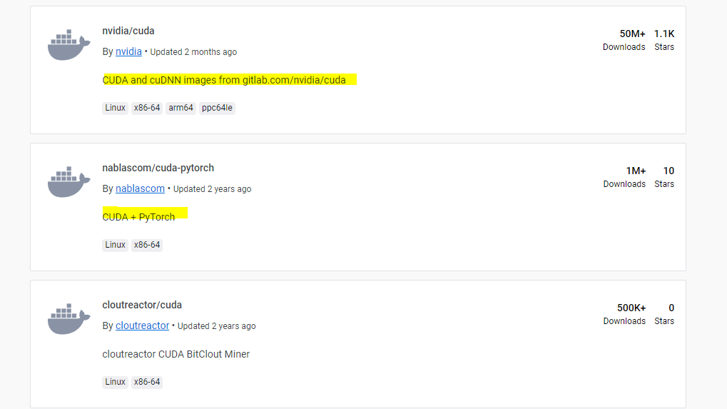 docker hub에 cuda을 검색하면, 아래의 그림과 같이 여러 이미지들이 검색되어 나온다.