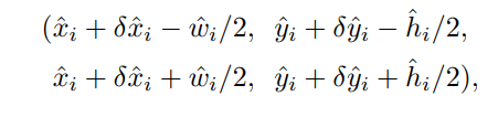 2. 그리고 각 예측치를 아래와 같이 구합니다. $\delta\hat{x}_{i}, \delta\hat{y}_{i} $은 offset prediction의 결과입니다. 예측한 heatmap의 좌표가 stride R때문에 실제 이미지에서 약간 이동될 수 있으니, 이를 보정하해줍니다. $\hat{w}_{i}, \hat{h}_{i}$은 사이즈 예측치입니다. 사이즈 예측을 위해서 중심점으로부터 좌측하단, 우측상단을 구하는 공식입니다. 총 4개의 좌표가 나옵니다. 이렇게 진행하면 딱히 non-maxima suppresion 또는 후처리가 필요가 없습니다. 그렇기에 one-stage detection입니다.