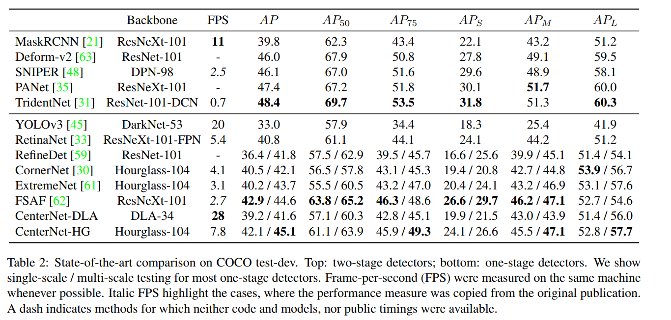 Table 2: coco dataset에서 대부분 알려진 모델들에서의 성능입니다. 위의 5개의 모델은 two-stage, 아래 모델들은 one-stage입니다. two-stage중에서는 MaskRCNN이 빠르내요. AP성능이 가장좋은것은 TridentNet입니다. 반면 one-stage에서는 Hourglass을 쓴 CenterNet이내요.