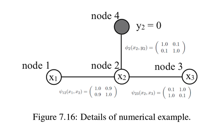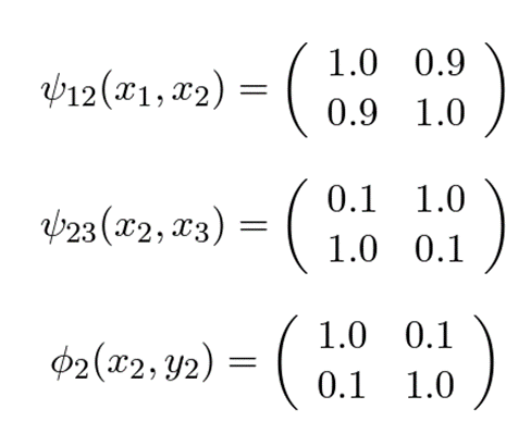 - $\phi(x_{i}, y_{j})$: 관찰되지않은 노드($x_{i}$)와 관찰된 노드($y_{j}$)의 종속성을 의미합니다. 위의 표기와 다르게 한쪽이 관찰되지 않을 때 쓰는 notation입니다. 영문표기로는 evidence for x라고 합니다. 이미 y은 결정되어있으니 x을 구하기위한 근거라는 것이죠.