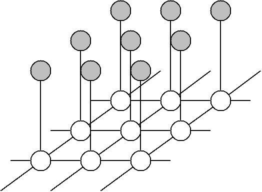 위의 그림1은 마르코브 랜덤필드의 흔한 예시입니다. 격자형으로 마르코브 속성을 가집니다. 쉽게 말해서 각 노드들이 확률변수 일때, 변수들 변수들간의 상호 의존성이 존재한다는 것입니다. 마르코브 속성은 현재상태가 과거상태에만 의존한다는 것인데, 이전 과거의 T상태전까지(T memory markcov라고도 함)영향을 받을 수 있음을 의미합니다. 위의 격자모형의 그래프에서는 상호의존성을 인접한 노드에서 받을 수 있습니다. 좀 더 나아가서 인접한 노드라고하지만, 이 인접한 노드들은 주변의 인접한 노드가 또 있기에(2칸 떨어진) 이전 T상태전까지 영향을 받는것처럼 생각할 수도 있습니다(하지만 2칸떨어진 노드가 직접영향을 주는 것은 절대아닙니다. 그럴거면 2칸 떨어진 노드에 직접 연결되어있어야합니다.).