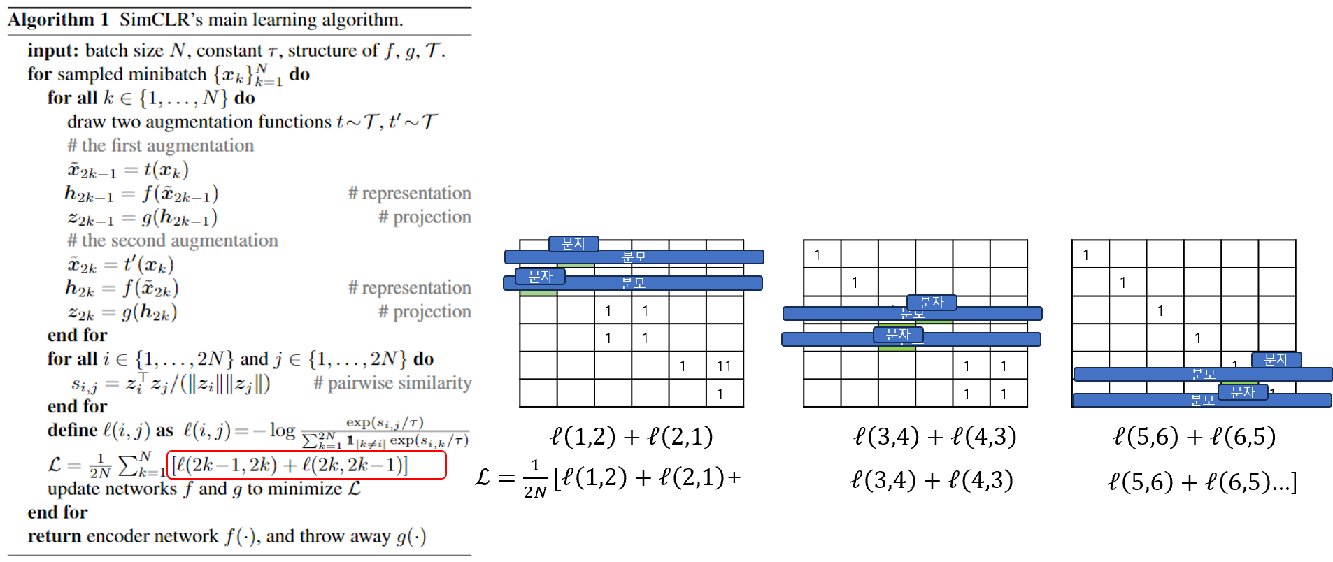 전체적인 SimCLR의 알고리즘은 아래와 같습니다. 그리고, 이를 시각화하면 아래와 같은 메트릭스 연산을 하는 것과 동일합니다.