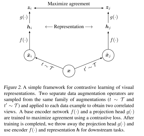 - Projection head: $g()$. base encoder가 생성한 벡터를 비선형변환을 하는 MLP을 의미합니다. 그 결과 벡터 $z$가 생산됩니다.