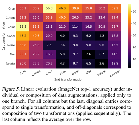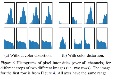 이 고민에 대해서 실험적으로 여러 짝으로 진행해보았고, 그 결과로 컬러왜곡(color distortion)과 Crop의 조합이 가장좋았습니다.