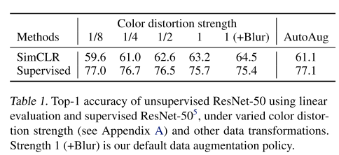 이러한 컬러 왜곡을 더 강하게 줄 수록, 비지도학습에서의 성능이 더 향상된다고합니다. 지도학습보다 더 좋은 성능이다라는 것이 아니라, 컬러왜곡을 지도학습과 비지도학습에 둘다 적용할때, 강도를 세게했을때는 SimCLR에서 더 효과가 좋았다라는 것입니다.